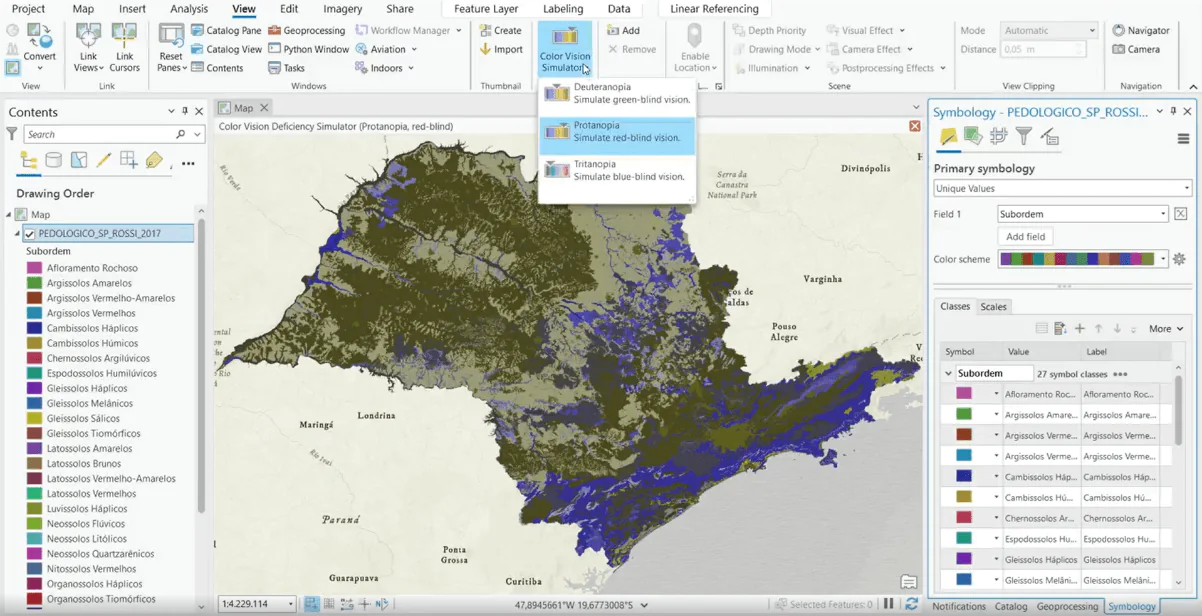 4. Acessibilidade: O ArcGIS Pro foi desenvolvido com foco na acessibilidade, garantindo que pessoas com deficiência possam utilizar o software de forma eficaz. Recursos como compatibilidade com leitores de tela e suporte para atalhos de teclado personalizados permitem que usuários com diferentes habilidades possam trabalhar no ambiente do ArcGIS Pro. Uma outra grande integração de acessibilidade, com a atualização da versão do ArcGIS Pro 3.0, é possível alterar as cores do seu mapa para simular a aparência para pessoas que possuem algum tipo de daltonismo.