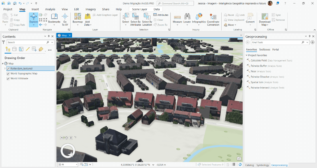 5. Dados 3D: O ArcGIS Pro oferece suporte completo a dados 3D, permitindo a visualização, análise e edição de dados espaciais em três dimensões. Com recursos avançados, como a criação de perfis de terreno, a análise de visibilidade e a simulação de sombreamento, os usuários podem explorar e compreender melhor o ambiente tridimensional.