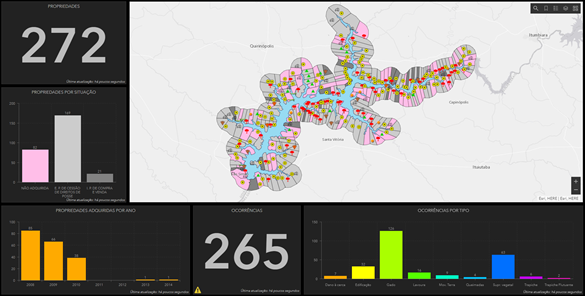 Na figura abaixo, usando o exemplo de um reservatório, pode ser observado um painel de gestão ambiental e fundiário, onde através dos dados coletados em campo gerou-se uma base de dados geoespaciais no ArcGIS Online com informações em tempo real do status de cada propriedade e suas ocorrências, isso permitirá uma tomada de decisão mais assertiva e programar as próximas atividades com todos os dados sendo vistos em um painel gerencial.