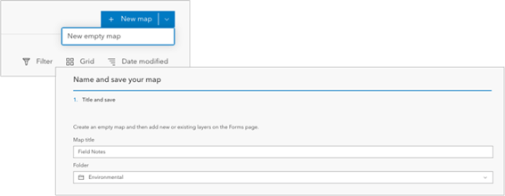 Às vezes, a melhor maneira de começar é com uma tela em branco. Novo no Field Maps Designer, a capacidade de criar um Novo mapa vazio foi adicionada, clicando no menu suspenso +Novo Mapa. Criar um mapa vazio é útil se você já tem camadas prontas para fluxos de trabalho de campo. Ao fornecer um nome para o mapa e indicar a pasta onde ele será salvo, você pode criar um mapa vazio para começar.