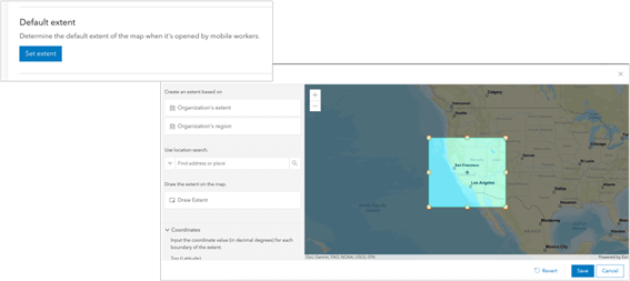 Na seção de Mapa da página de Configurações do Aplicativo, agora você pode definir a extensão padrão do mapa ao ser aberto pelos trabalhadores móveis. Utilize a extensão ou região da organização, encontre uma localização, desenhe a extensão ou insira coordenadas.