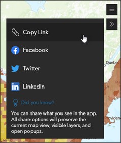O botão Compartilhar agora captura a aparência atual do aplicativo, como a extensão do mapa, camadas visíveis e pop-ups abertos.