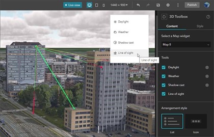 O Caixa de Ferramentas 3D adiciona efeitos 3D e ferramentas de análise para cenas da Web globais e locais. O widget suporta luz do dia, clima, sombra e ferramentas de visão.