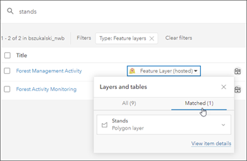 Quando você pesquisa itens, o ArcGIS Online agora encontra as subcamadas e tabelas dentro de itens da feature layer que correspondem às palavras-chave da pesquisa que você digita. Isso ajuda a revelar subcamadas e tabelas em resultados de pesquisa que antes não estavam disponíveis porque estavam escondidos dentro dos itens da camada.