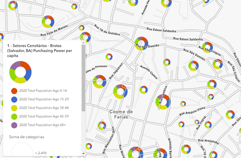 Dois novos estilos de mapeamento inteligente no Map Viewer permitem que você visualize dados numéricos categóricos como um gráfico de pizza. Use o estilo Gráficos para comparar categorias em um único recurso e o estilo Gráficos e Tamanho para comparar categorias em um único recurso e os totais entre os locais. Os símbolos do gráfico de pizza podem ajudar a responder perguntas como quais são as proporções de categorias para cada recurso em um mapa, ou comparando contagens ou outras estatísticas sumárias.