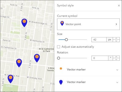 Agora você pode visualizar e personalizar símbolos de vetores multicamadas para pontos, linhas e polígonos no Map Viewer usando camadas de símbolo. As camadas de símbolo permitem que você estilize cada componente de um símbolo independentemente. O Map Viewer também suporta preenchimentos complexos de polígonos, incluindo preenchimentos de hachura feitos a partir de símbolos marcadores que podem ser distribuídos aleatoriamente ou uniformemente e com diferentes graus de densidade. Símbolos de vetor multicamadas podem ser usados ao estilizar uma camada ou criar uma camada de esboço.