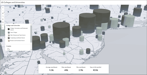 O Observer foi projetado para fornecer aos usuários a capacidade de explorar a cena e aprender mais sobre os dados. Você pode configurar um scoreboard que retornará estatísticas sobre recursos na extensão visível atual. O modelo também pode ser configurado com uma galeria de mapa base opcional e uma ferramenta de luz do dia.
