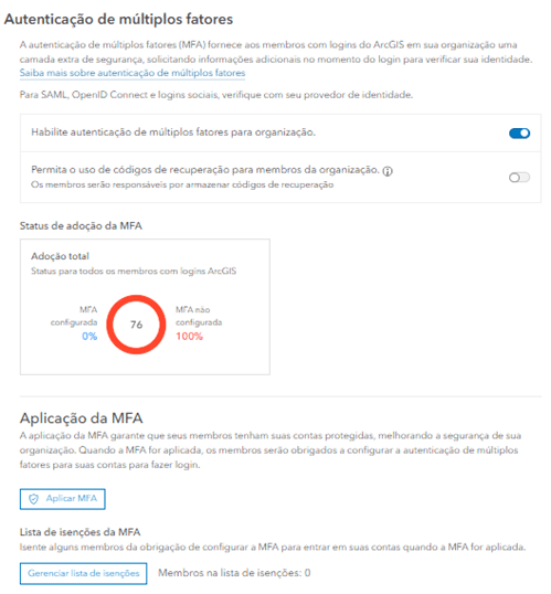 Uma vez estabelecido, os membros que entrarem com uma conta do ArcGIS serão obrigados a utilizar um aplicativo autenticador utilizando uma senha única baseada em tempo, como o Google Authenticator e outros. Os membros também podem configurar chaves de segurança usando opções como chaves USB, Face ID, leitores de impressão digital e telefones.