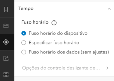 As opções de fuso horário incluem o uso do fuso horário do dispositivo, de um fuso horário específico ou do fuso horário dos dados. Eles podem ser definidos nas propriedades do mapa na barra de ferramentas Conteúdo.