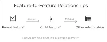 As relações de featute-to-feature vinculam um pai a um filho por meio de um campo de correspondência comum. Para começar a editar uma relação Feature-to-feature no ArcGIS Online, você deve ter uma camada de feição contendo dois ou mais recursos relacionados. Você pode criar relacionamentos no ArcGIS Pro e publicar no ArcGIS Online. Anteriormente, somente relacionamentos de feature-to-table eram suportados no ArcGIS Online.