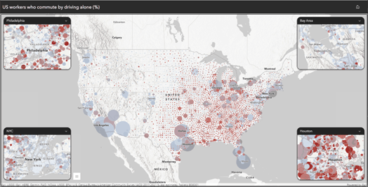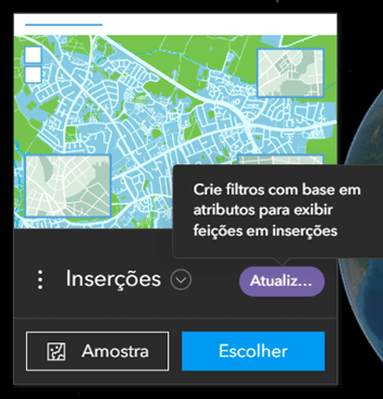 As inserções foram aprimoradas com layouts mais predefinidos, a capacidade de controlar a visibilidade da camada, uma opção para incluir uma barra de escala e dimensionamento de inserção responsivo. Além disso, os novos filtros de atributos ajudam os autores de aplicativos a controlar quais recursos são exibidos dentro de janelas internas específicas.