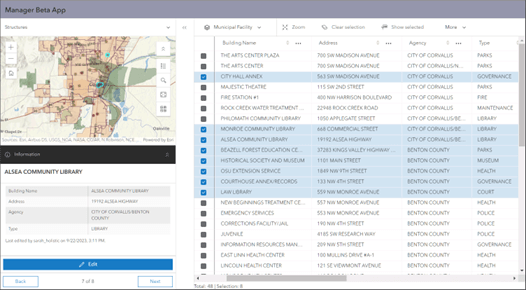 O Manager oferece a capacidade de adicionar vários mapas e revisar e modificar camadas editáveis. Depois de revisar os dados, as ferramentas de edição podem ser usadas para editar atributos, anexos e registros relacionados de recursos. O Manager também inclui um conjunto básico de ferramentas de exploração de mapas para navegar em mapas.