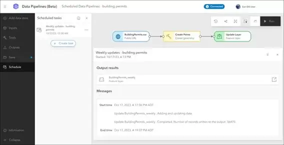 Os usuários agora podem agendar tarefas, permitindo que os pipelines de dados sejam executados em intervalos regulares, mantendo suas camadas de feição e tabelas atualizadas à medida que os dados de origem mudam. Os usuários poderão editar tarefas agendadas para modificar sua recorrência e exibir execuções de tarefas para revisar detalhes sobre a execução, como status, resultados de saída, mensagens e tempos de execução.