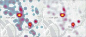 Você pode usar mapas de calor ao mapear a localização de feições pontuais. Os mapas de calor são úteis quando muitos dos pontos no mapa estão próximos ou sobrepostos, dificultando a distinção entre os recursos. Eles são eficazes para exibir camadas que contêm muitos pontos.