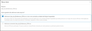 Opcionalmente, ao adicionar CSV ou GeoJSON de arquivos locais, você pode carregar o arquivo como um item e adicioná-lo ao mapa sem criar uma camada de feição hospedada.