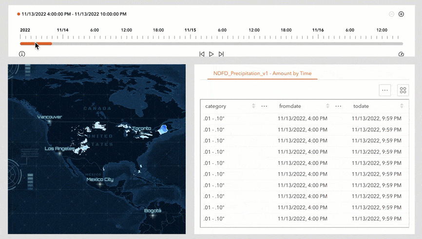 Quando você reproduz ou arrasta o controle deslizante de tempo inteiro para frente e para trás, uma tabela conectada aos mesmos dados será filtrada automaticamente.