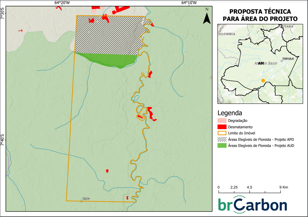 A metodologia da Verra, Verified Carbon Standard (VCS) – Methodology VM0007 Reduction of Greenhouse Emissions form Deforestation and Degradation and conservation of carbon stocks and forest management (REDD+) Methodology Framework (REDD+ MF) Version 1.6, por exemplo, detalha em sua seção 5.1 Geographical Boundaries as premissas para definição geográfica de Área de Projetos. Nesta operação, foram concatenados sequencialmente vinte e cinco (25) operações de geoprocessamento para definição da Área Elegível de Floresta (AEF) no imóvel rural. Foram utilizadas diversas funções e operações distintas de álgebra de mapas como corte, junção, intersecção, cálculo de áreas, entre outras.
