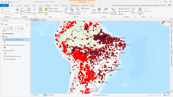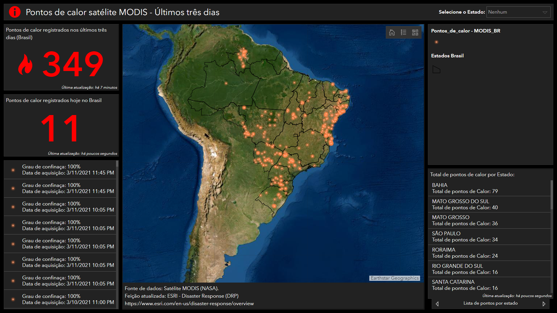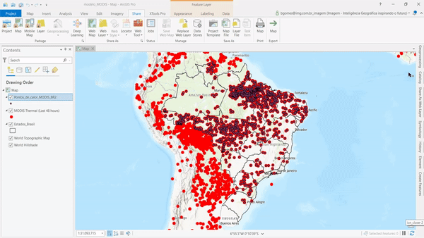 Bem, para esse exemplo de automatização resolvi utilizar dados de focos de calor do satélite MODIS através de uma feição disponibilizada pela ESRI. Os dados serão publicados no ArcGIS Online e será montado um Painel para que possam ser consultados os dados atualizados diretamente pela web.