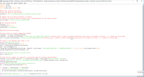 Com o dado publicado, agora é possível pensar em uma estrutura de atualização para ele. Hora de substituir o serviço toda vez que o modelo rodar, pois os dados disponibilizados são sempre dos últimos três dias. Para isso o ideal é montar um código em Python que faz uma substituição do serviço já existente em meu ArcGIS Online. Acesse o Script aqui!