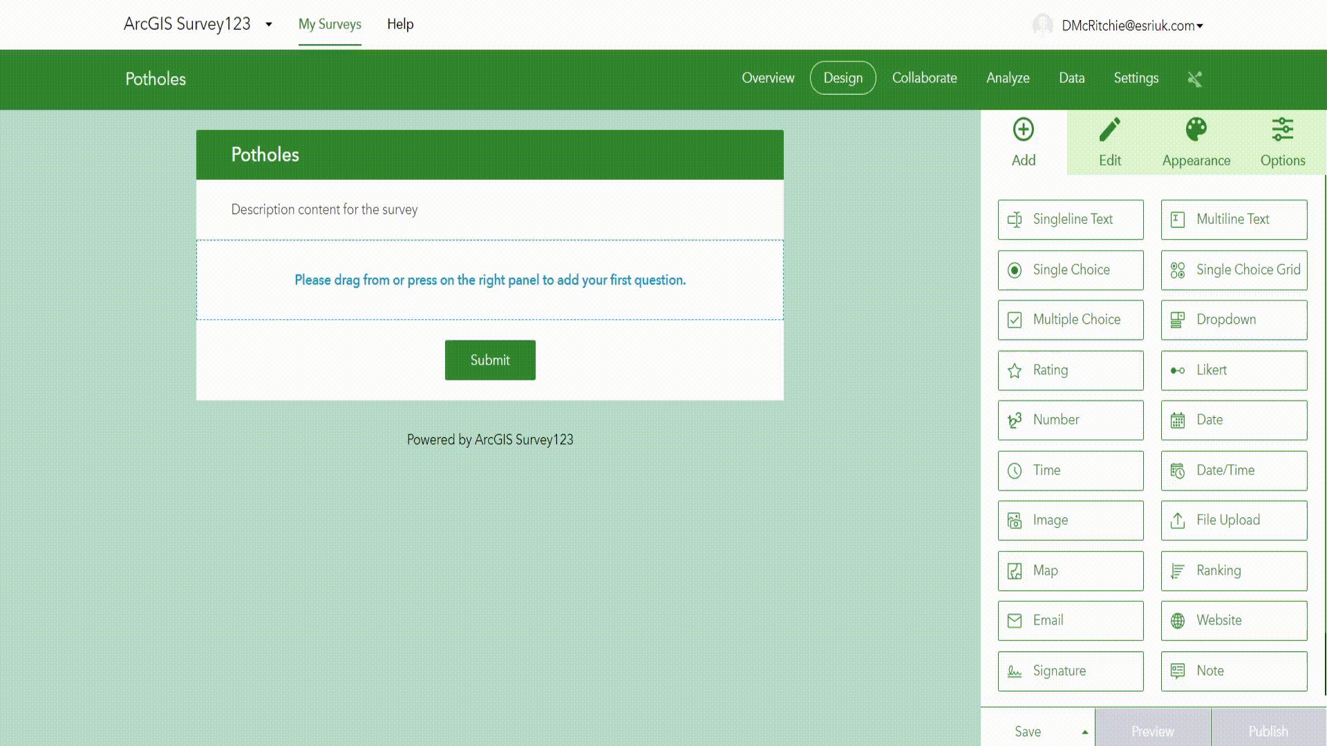 O Survey123 Web Designer é uma interface baseada em navegador e é ideal para criar formulários inteligentes quando o público principal utiliza esses formulários no aplicativo da web, sem a necessidade de instalar nenhum software adicional. A forte integração do Web Designer com os outros elementos do site Survey123 pode fornecer um único local para criação e gerenciamento de formulários.