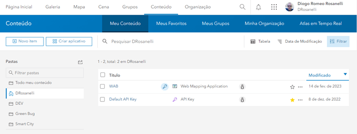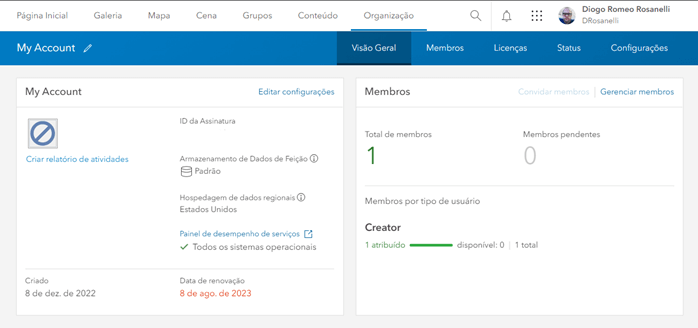 - Organização: configuração da organização e configurações do Portal GIS.
