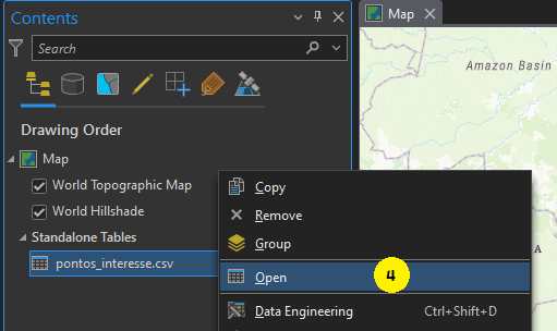 2. Na área de conteúdo do mapa, clique com o direito sobre a tabela adicionada, e selecione a opção Abrir (Open) para visualizar a tabela de atributos.