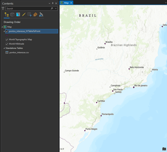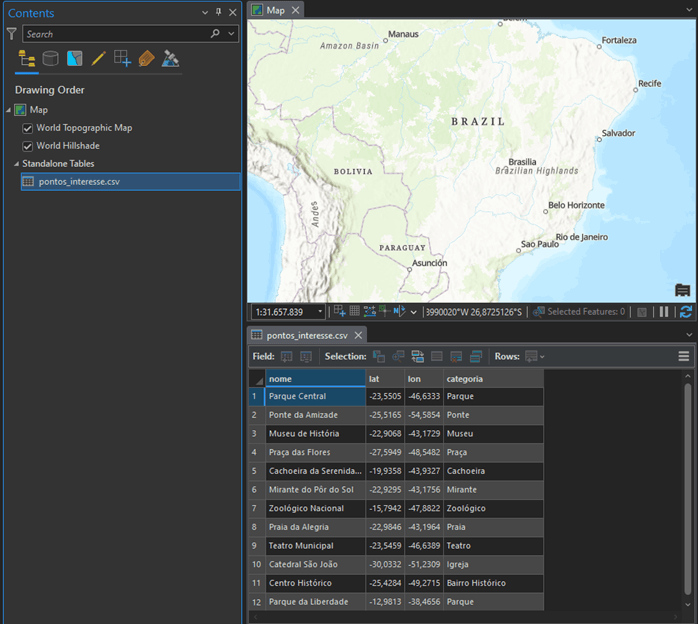 Com o arquivo “pontos_interesse.csv” em mãos, siga os passos abaixo para importá-lo no ArcGIS Pro: