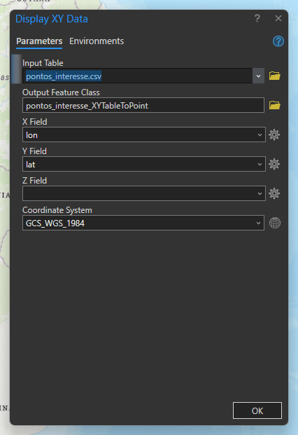 6. Você perceberá que a tela já vai trazer os campos pré-preenchidos, pois devido ao nome das colunas já se reconhece o tipo de dado que a ferramenta precisa. Clique em OK para que os pontos sejam adicionados ao mapa.
