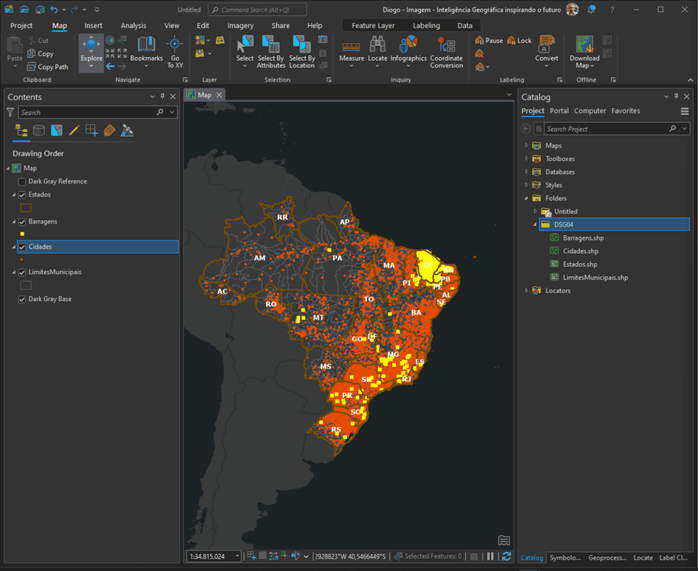- Abra o ArcGIS Pro e carregue o projeto de mapa que você criou anteriormente. Você deve ter mapeada no Catálogo a pasta onde tem os arquivos Shapefiles importados para o projeto.