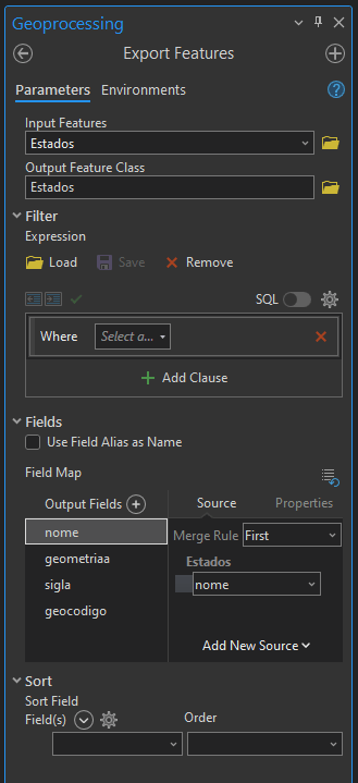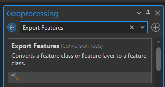 Caso na sua versão do ArcGIS Pro seja mais antiga, e não encontre a ferramenta Export Features, busque por Feature Class to Feature Class, que é a versão mais antiga que será descontinuada em breve.