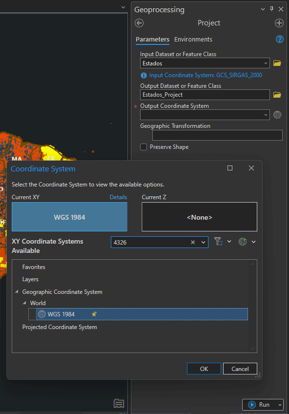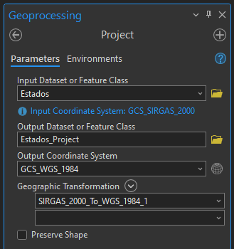 2. Utilize a ferramenta Projetar (“Project“) para converter a camada para o sistema de referência espacial WKID 4326. Ao realizar essa conversão, você garante que todas as camadas estejam alinhadas corretamente, evitando distorções e garantindo a precisão das análises espaciais.