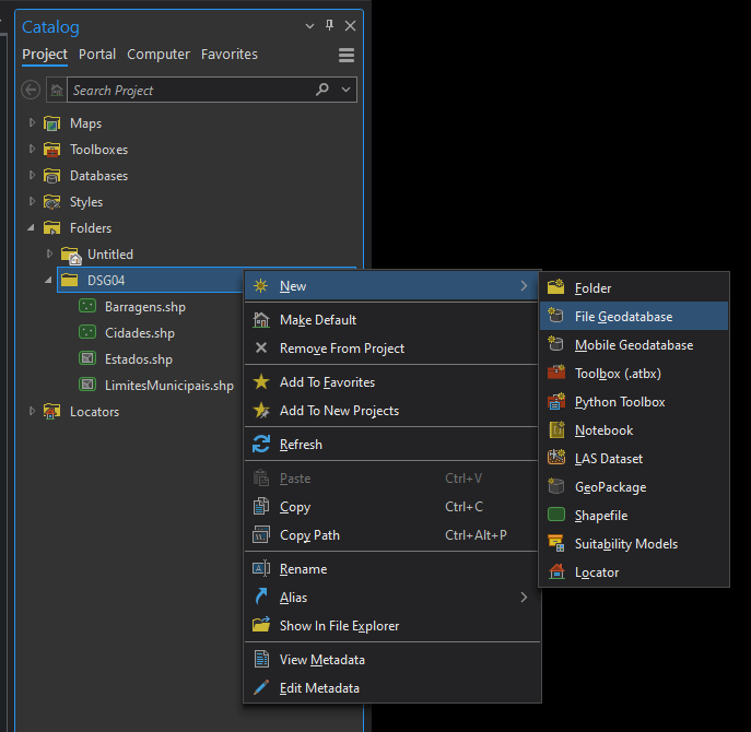 2. Vamos agora criar um File Geodatabase. Clique com o botão direito na pasta onde você descompactou os SHPs e selecione a opção Novo (New), e depois File Geodatabase. Ao ser solicitado o nome, informe DSG.gdb.
