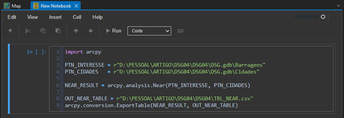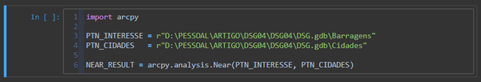 5. Vamos utilizar a ferramenta “Near” (Próximidade) do ArcPy para calcular a proximidade entre os pontos de interesse.