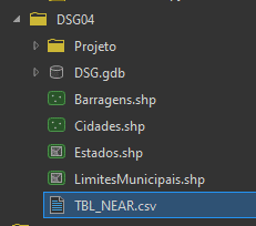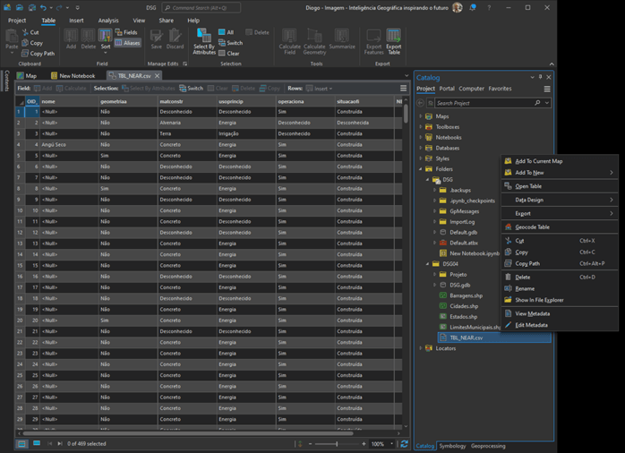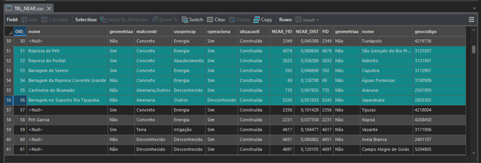 Você visualizará na tabela, os atributos da camada de barragens, e os identificadores das cidades próximas. Caso o campo de NOME da barragem esteja nulo, significa que a cidade não possui uma barragem próxima. Caso esteja preenchido, você poderá consultar através do campo NEAR_ID e do campo OBJECTID na camada de cidades qual cidade está próxima aquela barragem. Para facilitar a visualização, vamos utilizar a funcionalidade de JOIN de atributos.