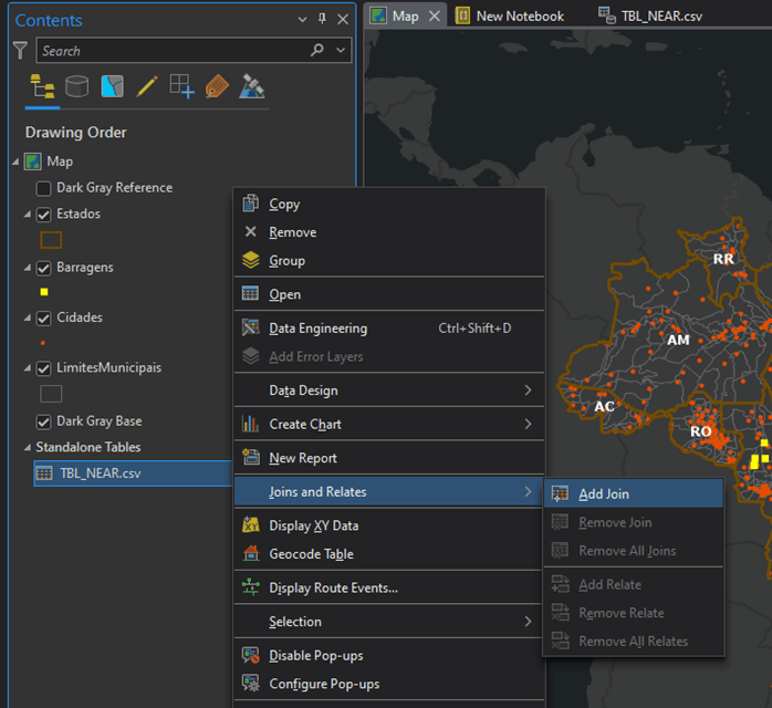 1. Na tabela de conteúdos de nosso mapa, clique com o botão direito sobre o arquivo CSV adicionado como camada, e vá até a opção “Join and Relates” (Ligações e Relações) e depois “Add Join” (Adicionar Ligação).