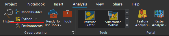 1. Na aba “Analysis” (Análise) clique na opção Python para criarmos um novo script Python no ArcGIS Pro utilizando o Jupyter Notebook que existe na ferramenta.