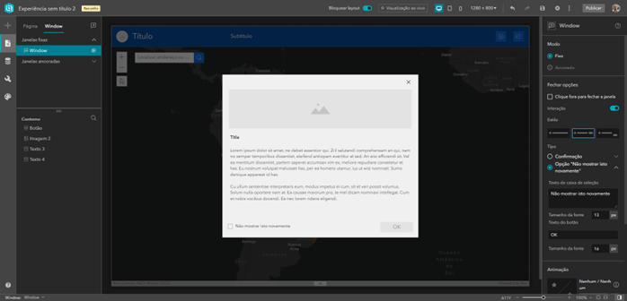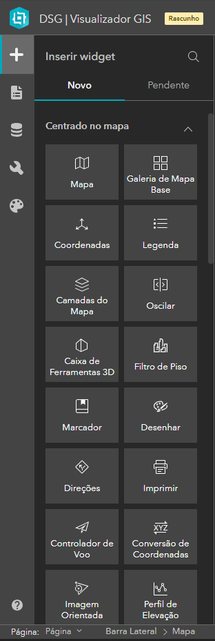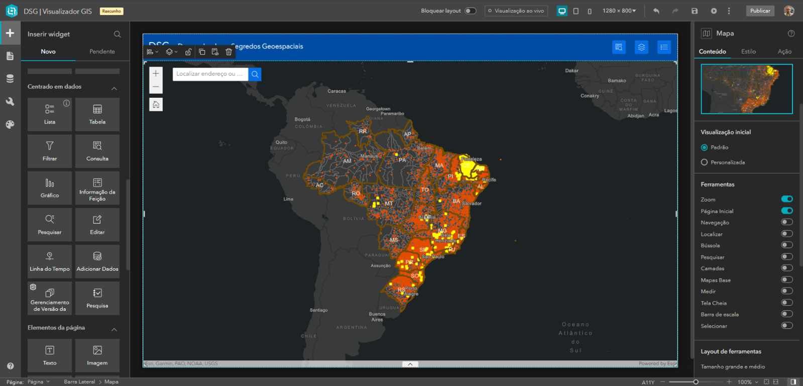 4. Configurações de Componentes: Após adicionar um componente a uma página, você pode configurá-lo nesta área. Por exemplo, para um mapa, você pode escolher as camadas que deseja exibir, definir a localização inicial e configurar pop-ups.