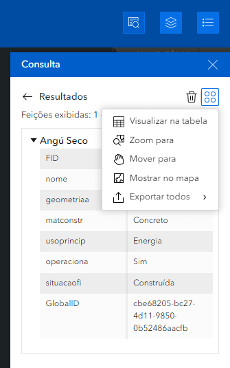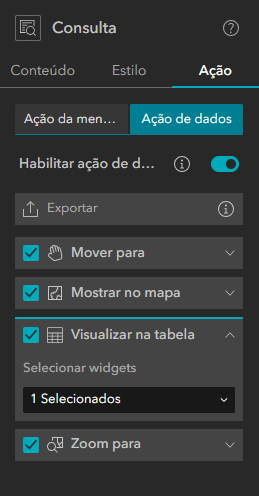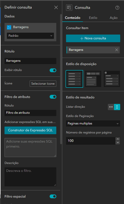 3. Configuração do Widget: Configure o widget de consulta para interagir com as camadas. Defina um pop-up personalizado para exibir informações sobre as barragens. Na estrutura da página inicial clique sobre o componente de Consulta adicionado. Vamos na sequência criar uma consulta para a camada de Barragens. Explore as configurações do componente de pesquisa.
