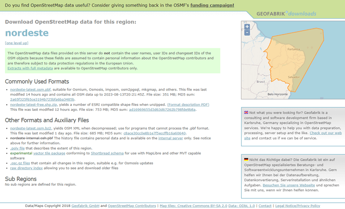 O site Geofabrik disponibiliza os dados do OSM mais recentes para download e lá vamos baixar o arquivo ZIP contendo os dados da região nordeste do Brasil, que vamos incorporar ao nosso projeto. No PDF disponível na mesma página, você encontrará todos os metadados relacionados ao dado.