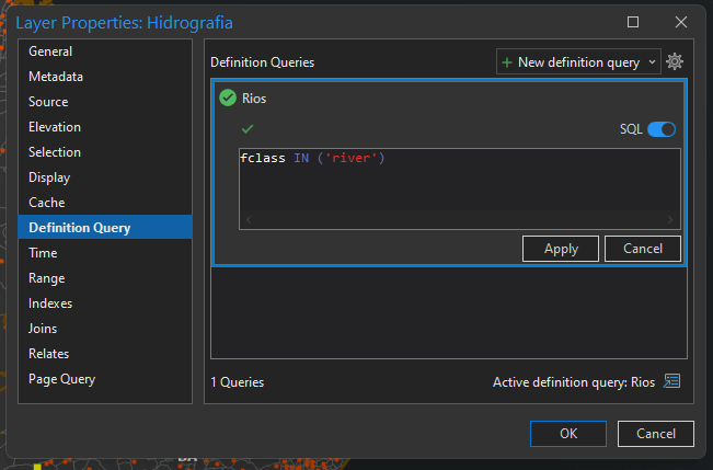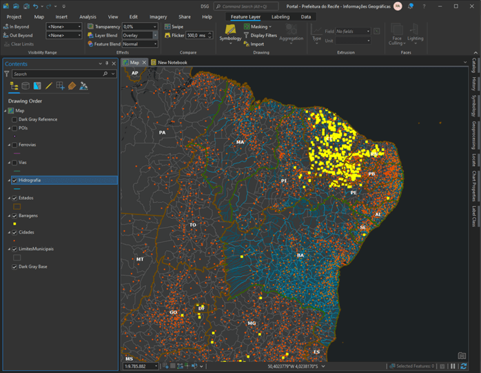 Um recurso que costumo utilizar bastante quando estou atuando com design de mapas é a aplicação de filtros para que meu dado represente somente as informações desejadas e também a utilização da barra de efeitos visuais da camada, o que me permite ajustar transparência ou comportamentos de exibição. No caso da camada de hidrografia, por exemplo, como ela será um dado somente de apoio visual, configuro a opção de mistura por feição (“feature blend“) para combinar sua simbologia com as demais do mapa. Você pode ainda configurar transparência, mistura por camada e escala de referência.