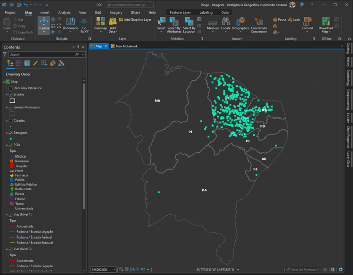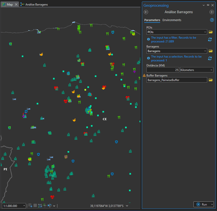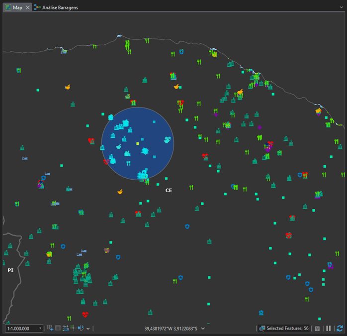 Vamos configurar a ferramenta para identificar pontos de interesse em uma área de 100 km de uma barragem selecionada no mapa.