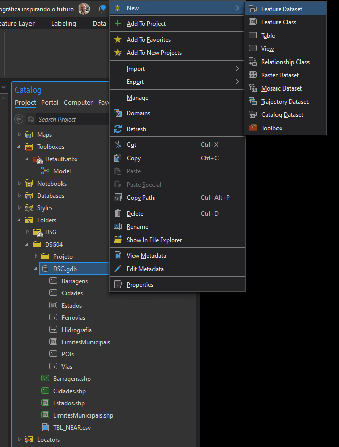 Em nosso File Geodatabase, clique com o botão direito e escolha a opção New Feature Dataset.