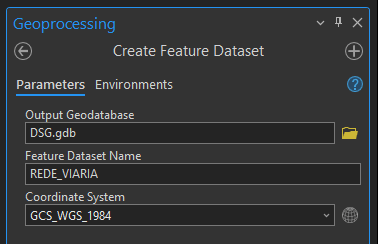 Importante destacar que aqui o dataset deve ter a mesma projeção dos dados que vamos armazenar nele, neste caso deve estar na projeção Geográfica com datum WGS84, que é o sistema de coordenadas do arruamento vindo do Open Street Map.