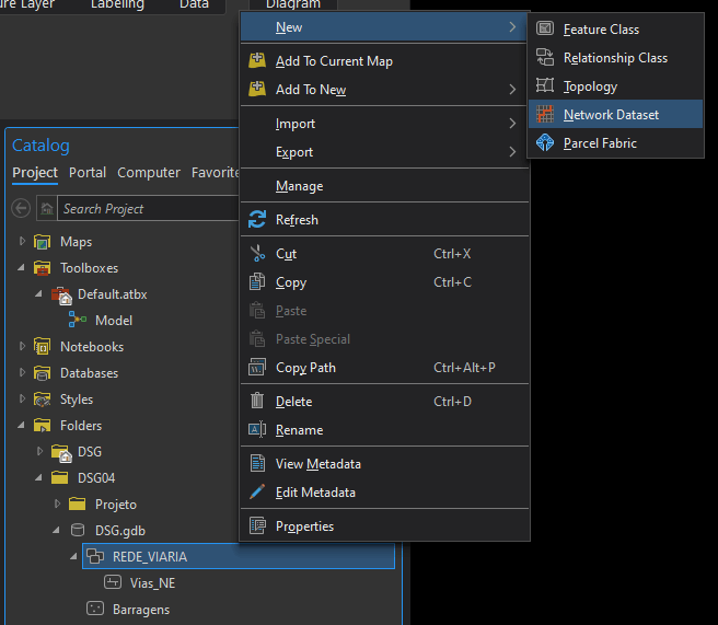 Copie o dado de vias para o Feature Dataset renomeando-o para VIAS_NE, e na sequência clique com o botão direito sobre o Feature Dataset criado, e escolha a opção New > Network Dataset. Nos parâmetros solicitados, você deverá selecionar todas as camadas que estarão presentes na rede geométrica, em nosso caso a camada de vias, e dar o nome ND_VIAS para a rede.