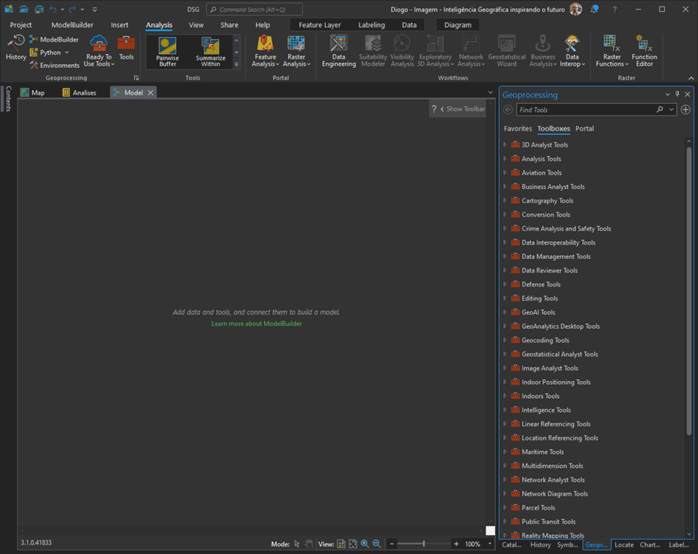 Vamos começar com um Model Builder, que é uma ferramenta de análise existente no ArcGIS Pro utilizada para criar um modelo de análise geoespacial automatizada, que inclui uma sequência de comandos lógicos para execução de uma regra de negócio específica.