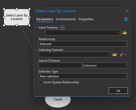Utilize a caixa de busca para localizar a ferramenta Select By Location, clique sobre a ferramenta na lista e arraste para o modelo, na sequência dê um duplo clique sobre a caixa da funcionalidade Select Layer By Location para visualizar todas as propriedades que podem ser configuradas.