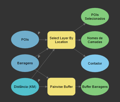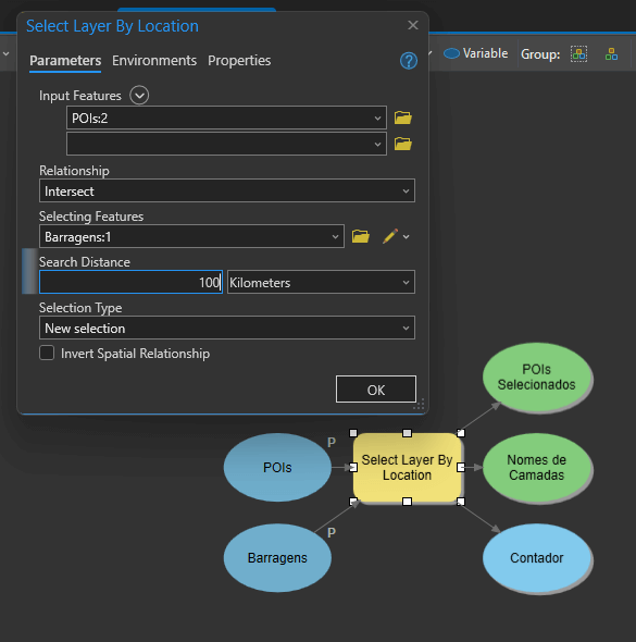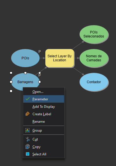 Um ponto importante a se observar em qualquer modelo são os parâmetros de entrada e saída. Você pode clicar sobre variáveis no modelo e defini-las como parâmetros que devem ser informados pelo usuário no momento da execução.