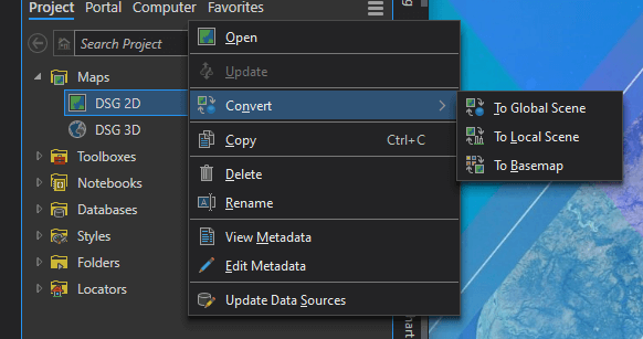 Agora precisaremos converter nosso mapa para uma cena 3D. Clique com o botão direito sobre o mapa DSG 2D e utilizando a opção Converter (“Convert“) e escolha uma das duas opções para conversão em cena (Local ou Global).