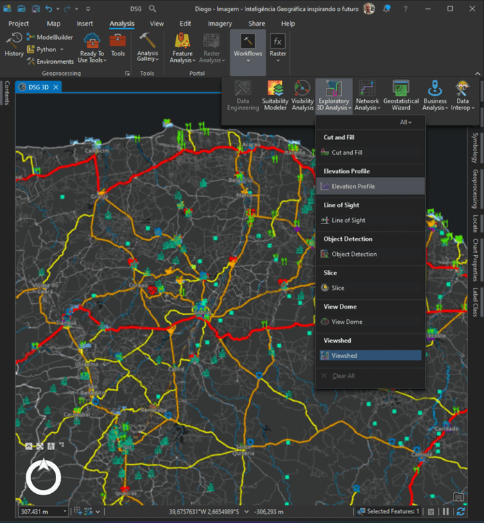 Abra o mapa 3D e agora vamos utilizar a ferramenta de análise de perfil de elevação. No menu Análise (“Analysis“) na opção Fluxo de Trabalho (“Workflows“) selecione o grupo Análises Exploratórias 3D (“Exploratory 3D Analysis“) e a funcionalidade Mapa de Elevação (“Elevation Profile“).