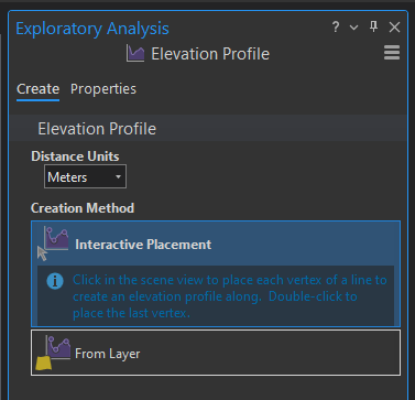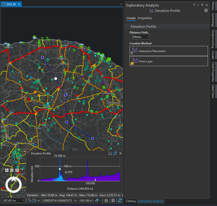 Com esta ferramenta, você poderá desenhar pontos livremente sobre a cena 3D ou selecionar uma camada de pontos para visualizar o perfil de elevação no trajeto desenhado entre os pontos. Após desenhar os pontos será possível visualizar o perfil de elevação do terreno no trajeto desenhado. Ao passar o mouse sobre o gráfico, você poderá acompanhar no mapa a localização do ponto correspondente, identificando a altitude associada.